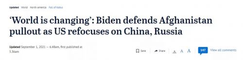 自夸一番后,拜登还道出阿富汗撤军的真实意图。拜登说,他选择结束阿富汗战争是为了将国家防御重点放在其他安全问题上,包括应对“中国和俄罗斯的挑战”。