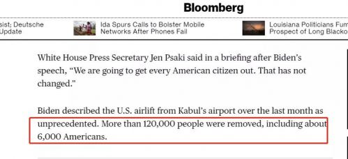 他称,美国在阿富汗的撤军行动已完成,在过去的一个月里,超过12万名人员被疏散,其中包括约6000名美国公民。
