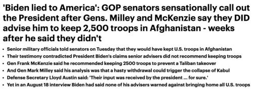 米利和麦肯齐在作证时均表示,美国总统拜登在八月的一次电视采访中表示,军方没有敦促他在阿富汗保留军队,这证明他是不诚实的。