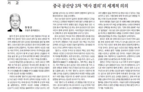 星岛环球网消息:中评社北京12月12日电/据外交部网站报道,2021年12月10日,驻光州总领事张承刚在韩国《光州日报》发表署名文章《中国共产党第三个历史决议及其世界意义》,宣介党的十九届六中全会精神和《中共中央关于党的百年奋斗重大成就和历史经验的决议》。全文如下: