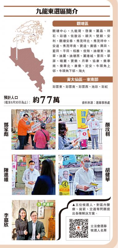 九龙东选区人口约77万,其中观塘区贫困人口为全港最高,又因长者众多,医疗、贫穷、交通被形容为压在九龙东的“三座大山”,亦是当区居民长期希望解决的问题。今次共有五位候选人竞逐九龙东两个席位,包括工联会前立法会议员邓家彪、民建联观塘区议员颜汶羽,首次参选立法会的民主思路陈进雄、注册中医师李嘉欣,以及物业管理行政顾问胡健华。多名候选人分别提出不同方案,应对“三座大山”。/大公报记者 常彧璠