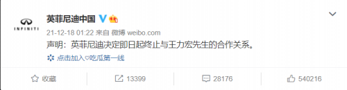 12月18日凌晨,英菲尼迪官方微博@英菲尼迪中国 发布声明,声明写道:“英菲尼迪决定即日起终止与王力宏先生的合作关系。”12月16日,王力宏在个人微博中宣布与英菲尼迪合作,成为品牌代言人,目前该微博已被删除。