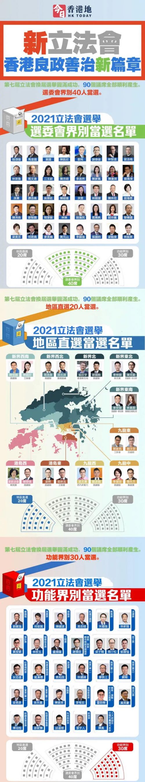 12月20日上午,香港特区第七届立法会分区直接选举界别、选举委员会界别、功能团体界别的投票结果陆续揭晓,90个议席全部顺利产生。