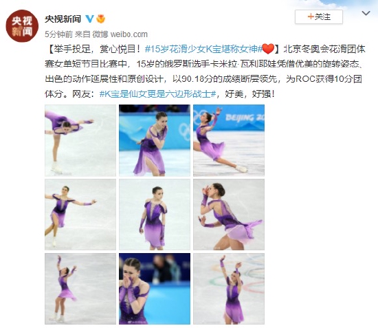 北京冬奥会花滑团体赛女单短节目比赛中,15岁的俄罗斯选手卡米拉·瓦利耶娃凭借优美的旋转姿态、出色的动作延展性和原创设计,以90.18分的成绩断层领先,为ROC获得10分团体分。网友:K宝是仙女更是六边形战士,好美,好强!