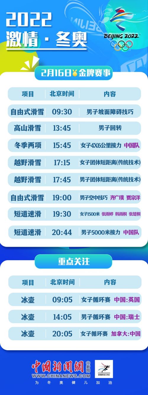 星岛环球网消息:中新网2月15日电 北京冬奥会16日将产生8枚金牌,最受关注的赛事当属短道速滑男子5000米接力以及自由式滑雪男子空中技巧。自由式滑雪男子空中技巧决赛时间为19:00,中国名将齐广璞、贾宗洋出战,两人的目标都是冲击最高领奖台。男子5000米接力A组决赛时间为为20:44,冬奥两金得主武大靖、任子威将与队友联袂出战。16日也是短道速滑项目的最后一个比赛日。此外,中国男、女冰壶队等也将出战。一起为中国健儿加油!(完)