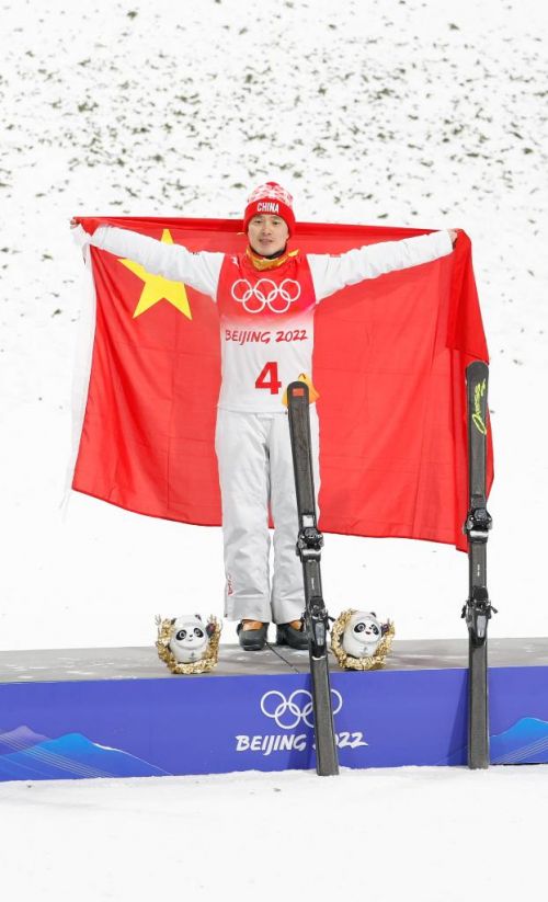 2月16日,中国选手齐广璞在北京冬奥会自由式滑雪男子空中技巧决赛获得冠军后庆祝。新华社记者肖艺九摄