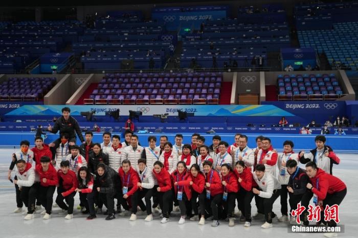 2月16日,北京2022年冬奥会短道速滑比赛在首都体育馆举行。赛后中国短道速滑队集体在首都体育馆冰面合影。 中新社记者 崔楠 摄