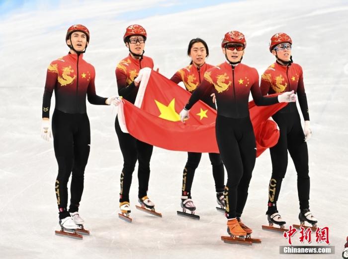 在2月5日晚结束的短道速滑混合团体接力决赛中,由武大靖、任子威、范可新、曲春雨组成的中国队率先冲过终点,为中国体育代表团拿到本届冬奥会首枚金牌。图为中国队选手在比赛后庆祝。 中新社记者 毛建军 摄