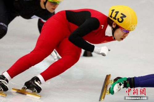 资料图:2014年索契冬奥会短道速滑女子1500米决赛中,中国选手周洋夺得冠军,成功卫冕,这也是中国代表团本届冬奥会第三枚金牌。图为周洋在决赛中。