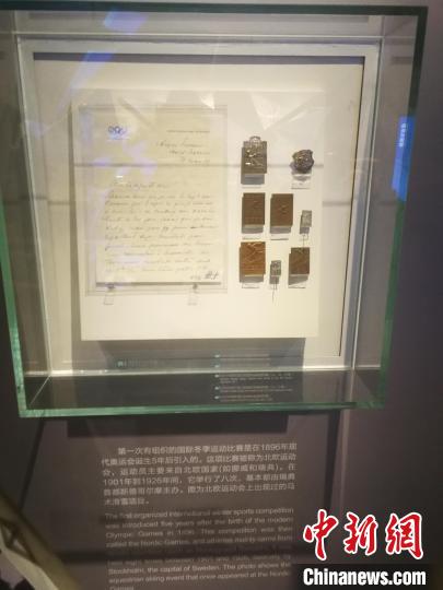 图为华侨冰雪博物馆里展出的顾拜旦手稿。 李晓伟 摄