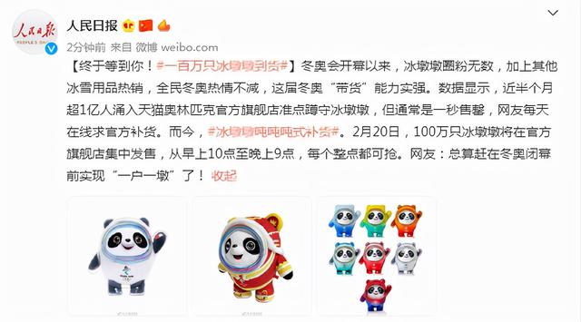冬奥会开幕以来,冰墩墩圈粉无数,加上其他冰雪用品热销,全民冬奥热情不减,这届冬奥“带货”能力实强。数据显示,近半个月超1亿人涌入天猫奥林匹克官方旗舰店准点蹲守冰墩墩,但通常是一秒售罄,网友每天在线求官方补货。而今,冰墩墩吨吨吨式补货。2月20日,100万只冰墩墩将在官方旗舰店集中发售,从早上10点至晚上9点,每个整点都可抢。网友:总算赶在冬奥闭幕前实现“一户一墩”了!