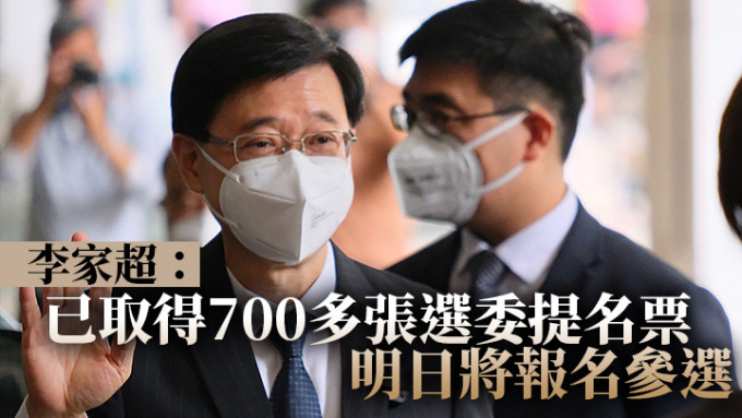 星岛报道,前政务司司长李家超早前宣布参选第6届行政长官选举,他今日下午以网上方式与选举委员会委员进行两场交流会,逾50名不同界别选委出席。他指今日与不同选委会面,收到很多宝贵意见,对撰写政纲有参考价值。他透露,截至傍晚6时,已收到逾700张选委提名票,明日将报名参选特首。他又指,现届政府正推动23条立法,若当选会继承有关工作。