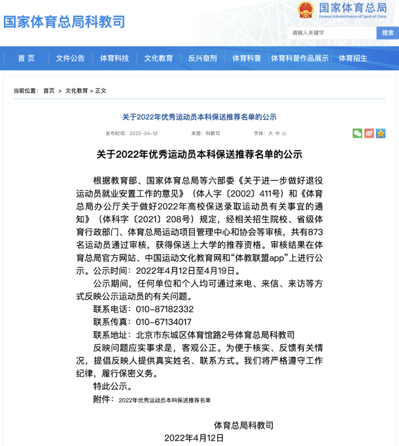星岛环球网消息:4月12日,国家体育总局科教司网站发布关于2022年优秀运动员本科保送推荐名单的公示,共有873名运动员获保送大学推荐资格,公示时间为2022年4月12日至4月19日。