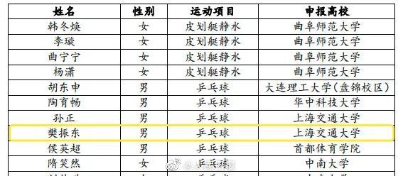 保送推荐名单显示,乒乓球运动员樊振东拟保送上海交通大学。
