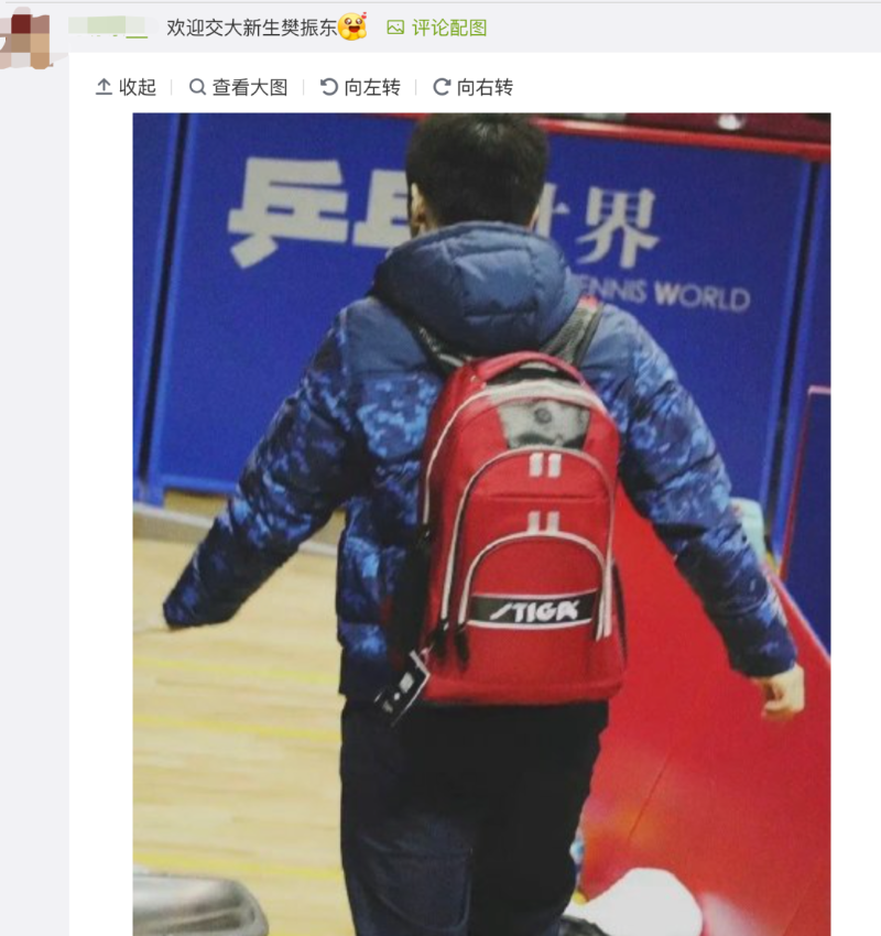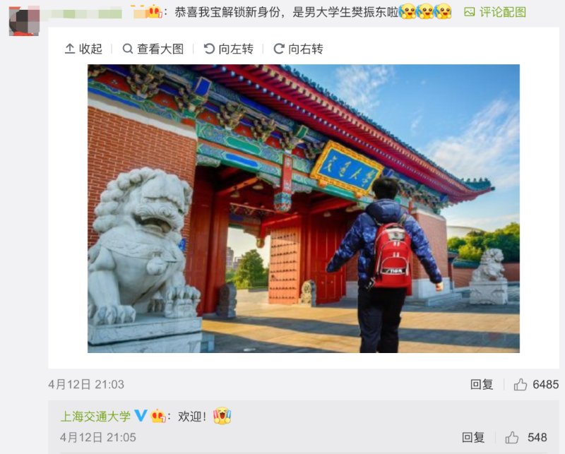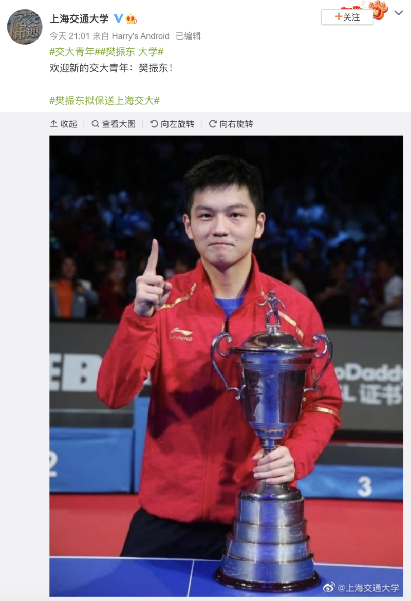 @上海交通大学 发布微博:“欢迎新的交大青年:樊振东!”