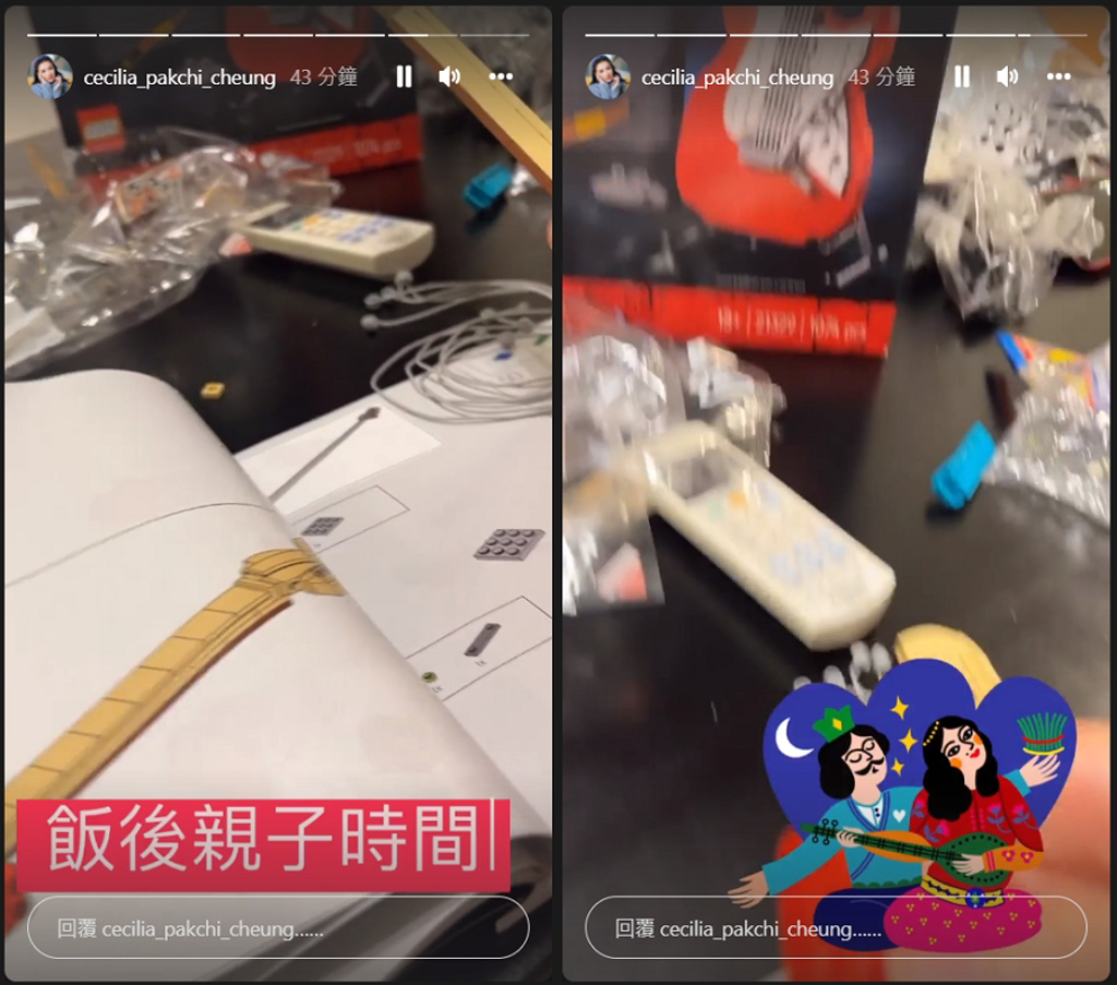 张柏芝分享和儿子们的饭后亲子时间,组装乐高的造型意外引起网友讨论。 (图/ 摘自张柏芝IG)