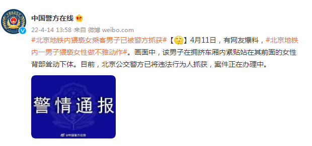 星岛环球网消息:4月11日,有网友爆料,#北京地铁内一男子猥亵女性做不雅动作#。画面中,该男子在拥挤车厢内紧贴站在其前面的女性背部耸动下体。目前,北京公交警方已将违法行为人抓获,案件正在办理中。