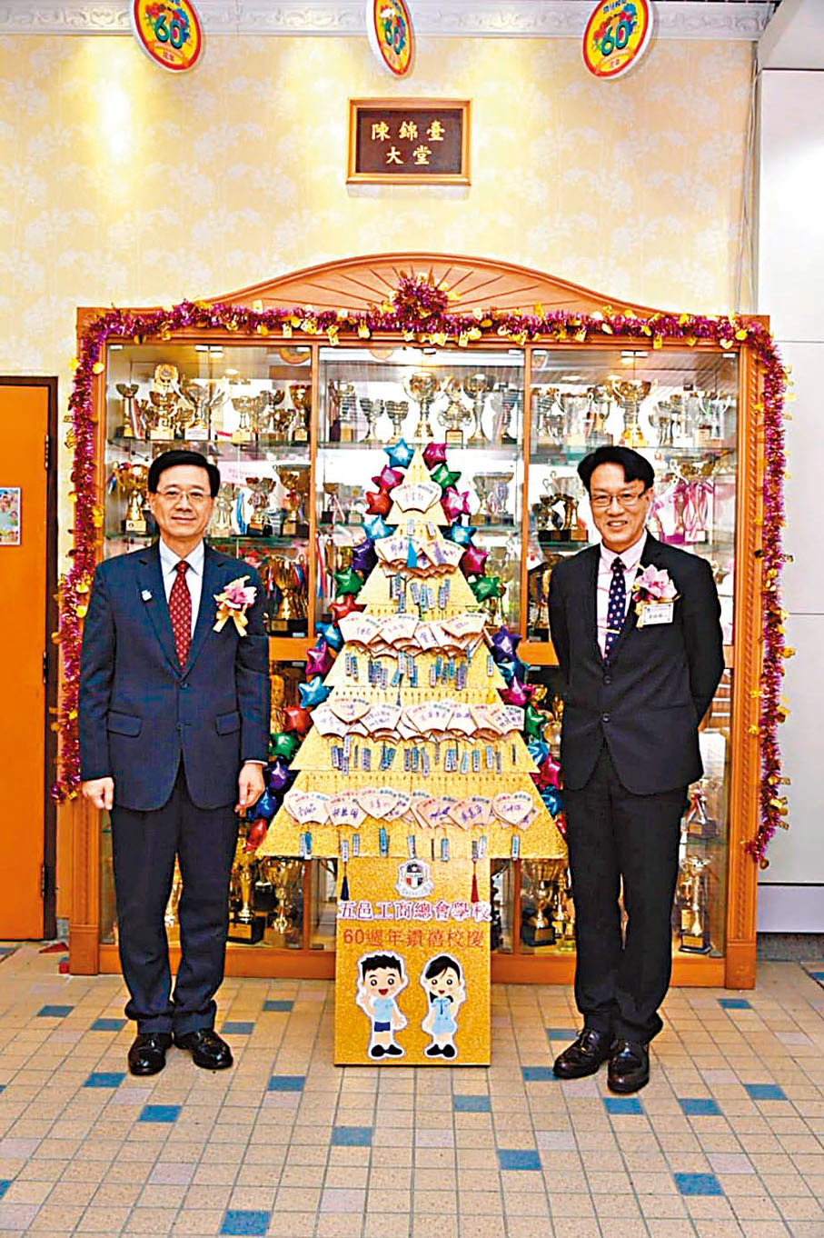 2018年,李家超为母校五邑工商总会学校鑽禧校庆主礼,与黄锦耀合影。 受访者供图
