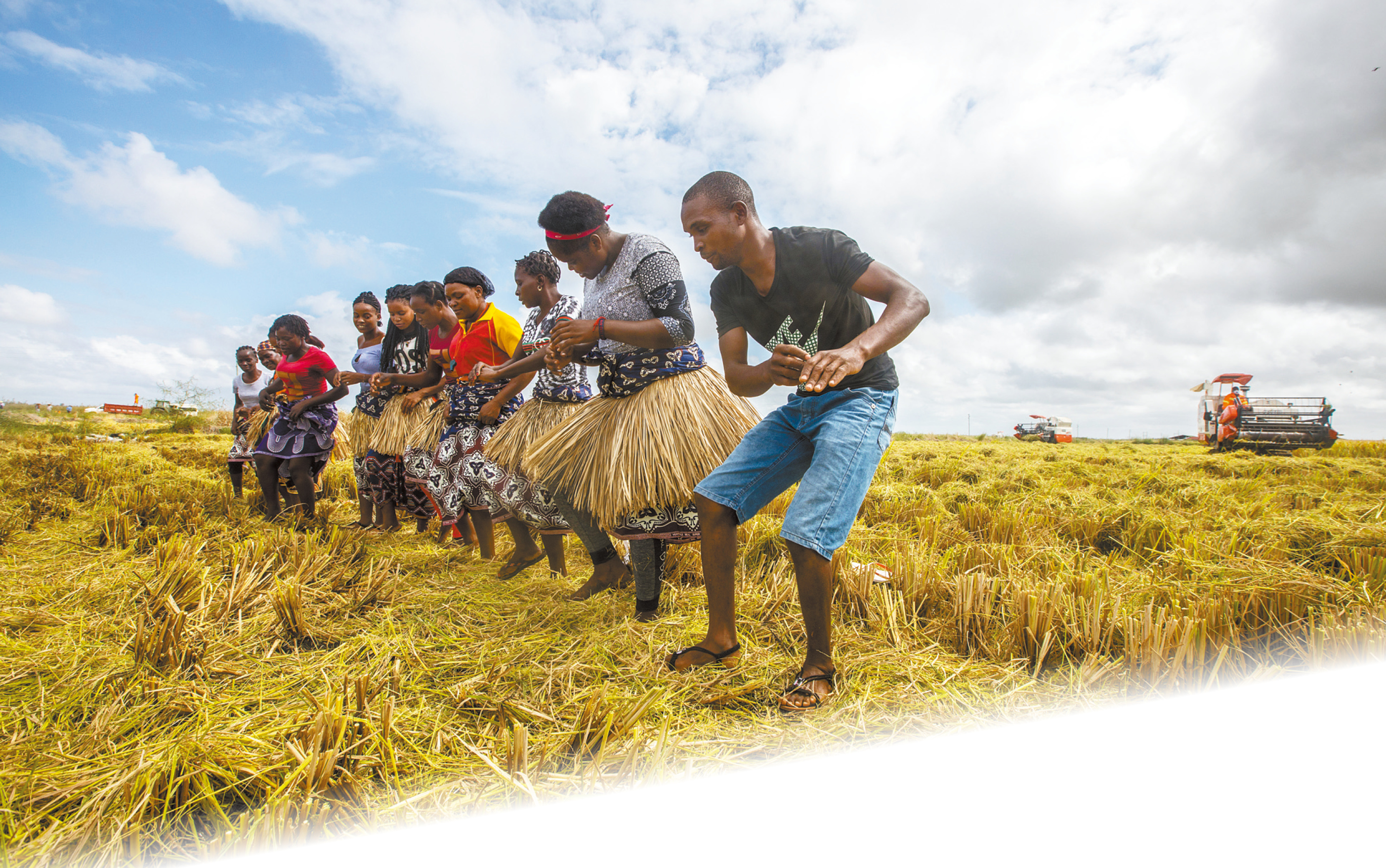 ■在莫桑比克万宝莫桑农业园,农户在水稻收割现场载歌载舞庆祝丰收。 资料图片