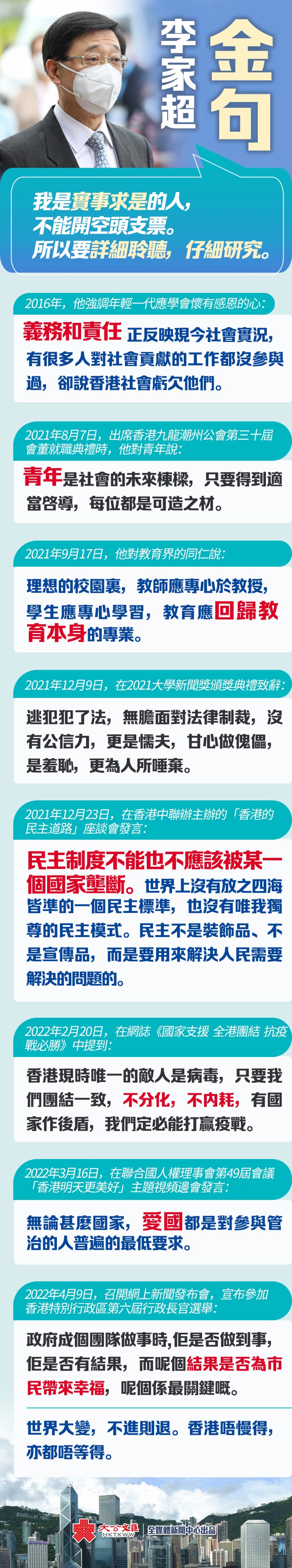 大公文汇全媒体报道:完善选举制度后的首场特首选举将于5月8日举行,前政务司司长李家超得到786位选委提名后报名参选。 李家超昨日(18日)通过资审会审核,正式成为今次选举的唯一候选人。 李家超出身警队,服务香港社会45载,社会各界都非常关心他即将发表的政纲,包括他过往的种种动向。 大公文汇全媒体整理了李家超过往的金句,助读者一图睇清!