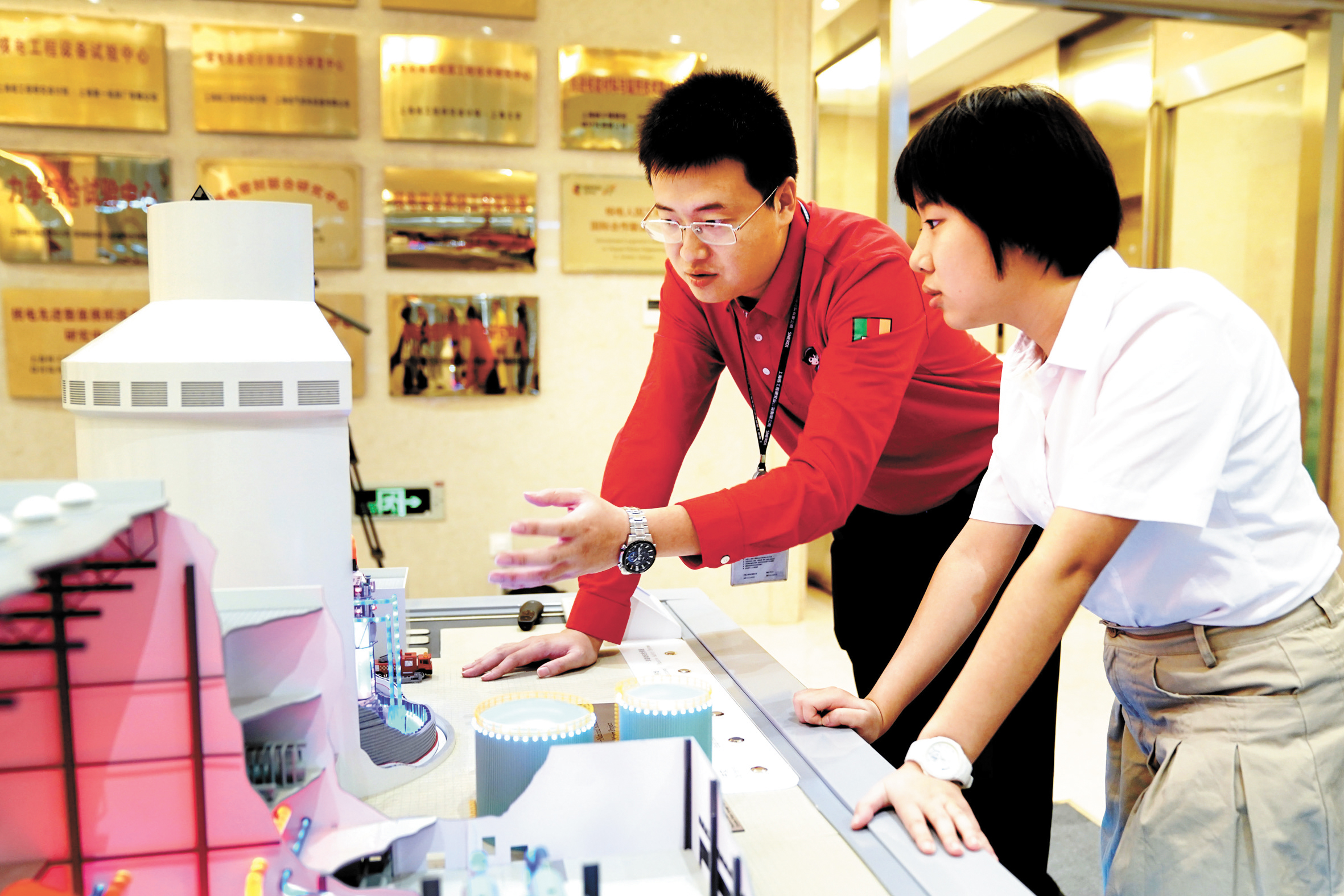 上海核工程研究设计院工作人员(左)向学生介绍核电站知识。新华社资料图片