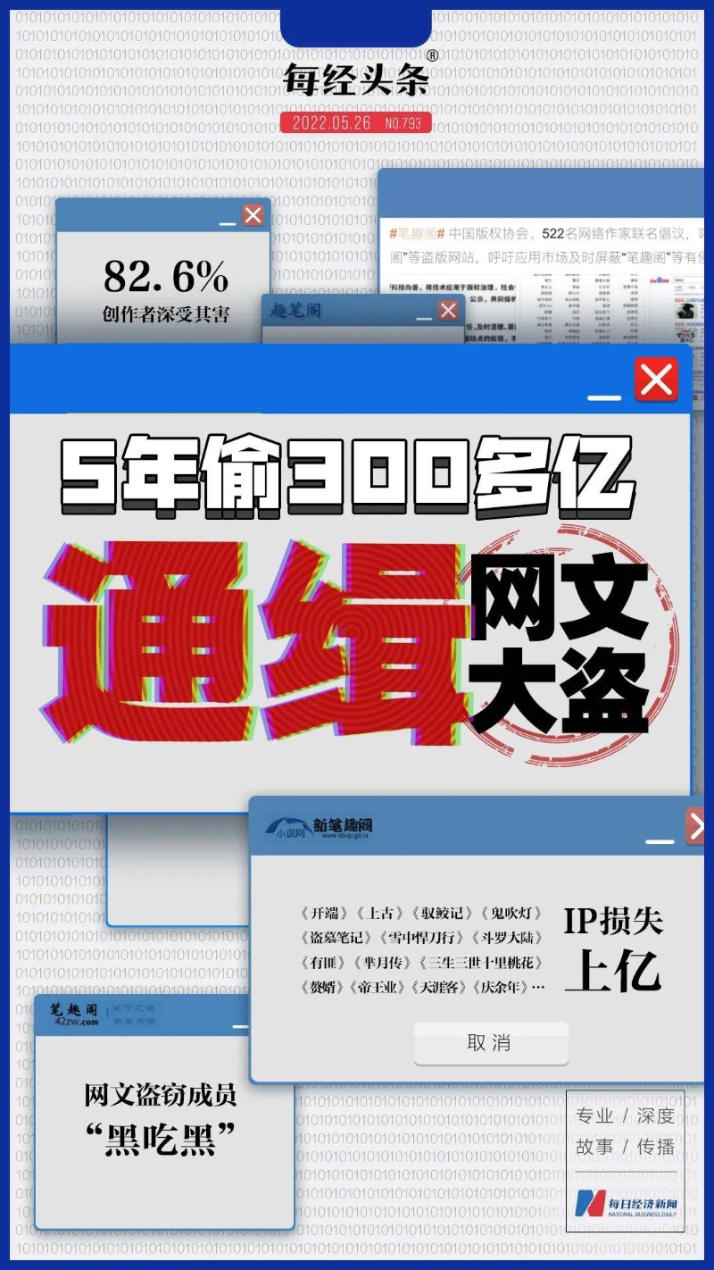笔趣阁宇宙 | “笔趣阁”诞生于2012年,其创始人因盗版网文,实现财务自由后移居新加坡,就把“笔趣阁”相关网站的开源代码以及如何建站向外公布。于是,千千万万个披着“笔趣阁”外衣的盗版平台,形成“笔趣阁宇宙”,依靠“搬运”小说章节获取非法收入,至少年入62亿元。“‘笔趣阁’不会去搬运已完结的小说,专偷正在更新的内容。”一位谙熟网文行业的资深人士告诉每日经济新闻记者,这导致作家收入锐减。