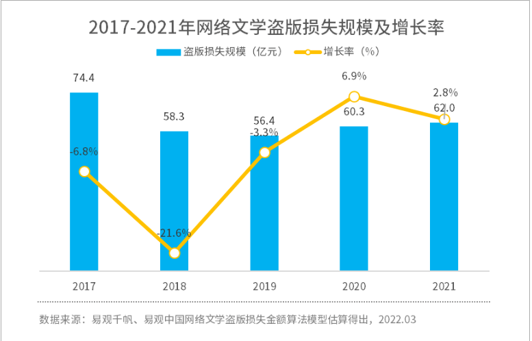 《2021年中国网络文学版权保护与发展报告》(以下简称《报告》)显示,2021年中国网文市场盗版损失62亿元,保守估计约占市场规模的17.3%。近5年(2017年-2021年),网文行业盗版损失累计高达311.4亿元。“多数网络文学平台每年超过80%的作品会被盗版,其中头部平台每年被盗版的作品数量达到3000部以上;各平台整体来看,高达82.6%的创作者深受盗版侵害”。[1]