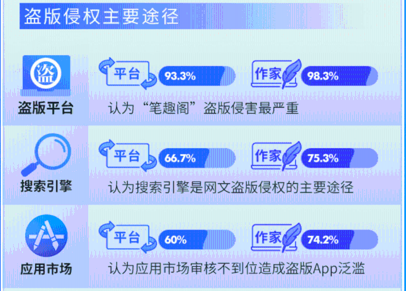 《报告》显示,59.6%的网文创作者认为,盗版会严重损害创作者和平台双方的经济利益,96.6%的创作者认为,盗版将会影响自己未来的创作动力。[1]