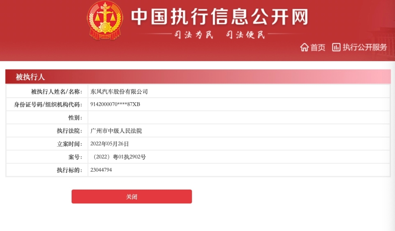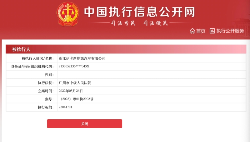 公开信息显示,2022年5月26日,东风汽车股份有限公司、浙江伊卡新能源汽车有限公司和浙江时空能源技术有限公司被广州市中级人民法院强制执行23044794元,案号为(2022)粤01执2902号。