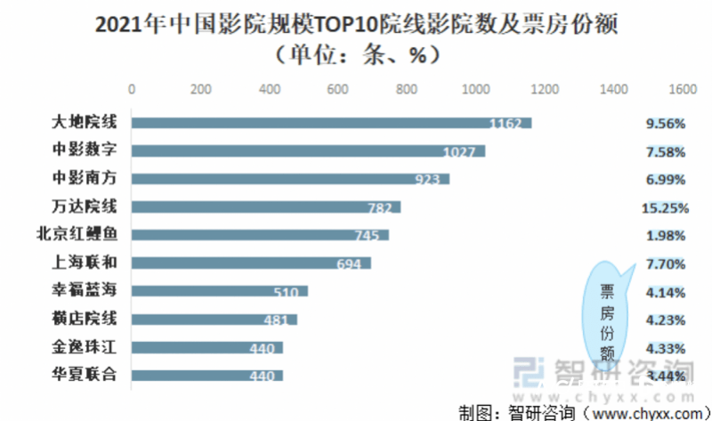根据智研数据统计,2021年底,大地影院的影院数量为1162家,屏幕数量为7178块,在全国影院公司中排名第一。但再对比今年五月的数据,可以看到,大地影院在数量上将近减少100家,占公司影院总数8.5%左右。