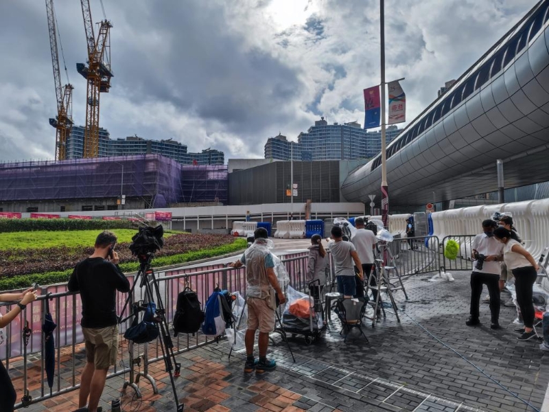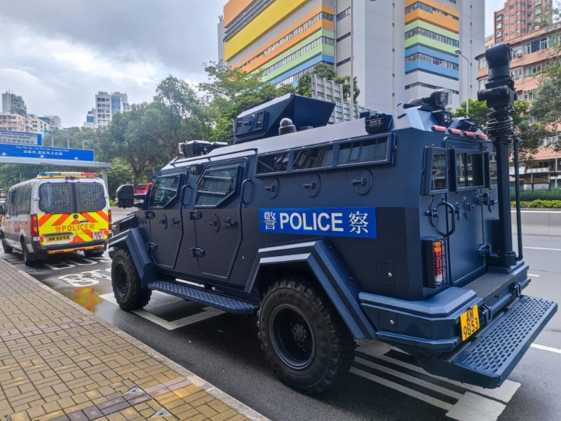 西九龙高铁站外的广东道,今早见到“剑齿虎”装甲车踪影,另有大批特警在高铁站外围巡逻,柯士甸站外亦有警员驻守。 大批传媒亦在西九高铁站外守候。