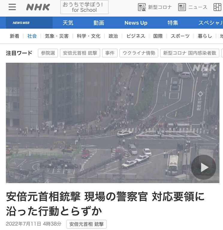 NHK报道称,8日案发时,嫌犯山上彻也在数米距离内向安倍开了两枪。日本警察厅方面对NHK说,在山上两次开枪之间,有将近3秒的间隔,警察厅方面认为,当时的现场警官未能遵循日本警察警卫保护重要人物时的应对指南行动。