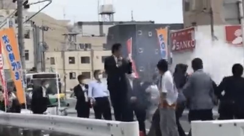 拍摄到安倍遭受枪击的现场视频显示,在响起第一声枪声后,安倍回头查看情况
