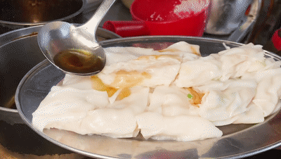 在恩平老字号——“喜记肠粉”店内,肠粉小哥陈明思在一个空蒸板上铺布、摊米浆、加料,再把蒸板推进蒸笼,待肠粉熟后,迅速抽出,左手拿起布,右手拿着刮片,快速地将布上的肠粉刮下,再竖切三下上碟,整个过程行云流水。没过多久,他便驾轻就熟地把一碟热气腾腾的布拉肠粉端到客人面前。
