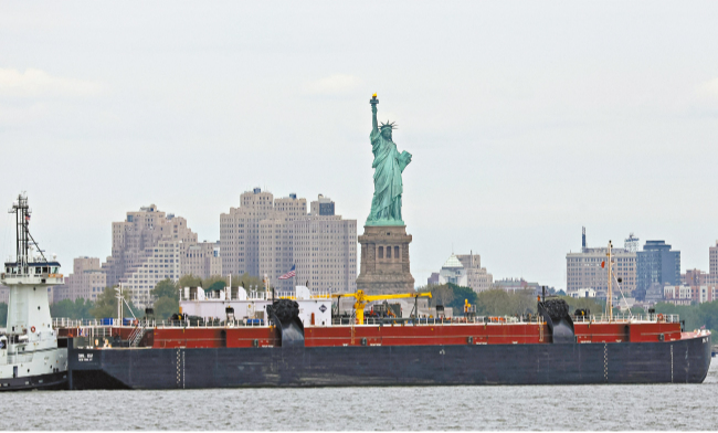 · 一艘拖船将一艘油驳船推过纽约港,经过美国纽约市的自由女神像。路透社资料图片