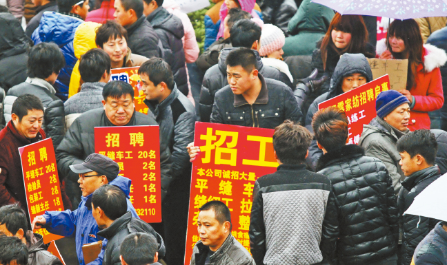 · 中国工厂正遭遇招工难问题。图为在江苏南通,家纺企业员工手举广告招工。新华社资料图片