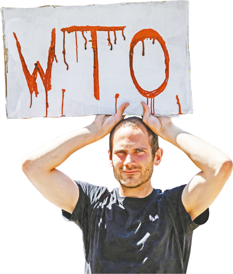 · 一名示威者举着反世贸组织标语牌 。法新社