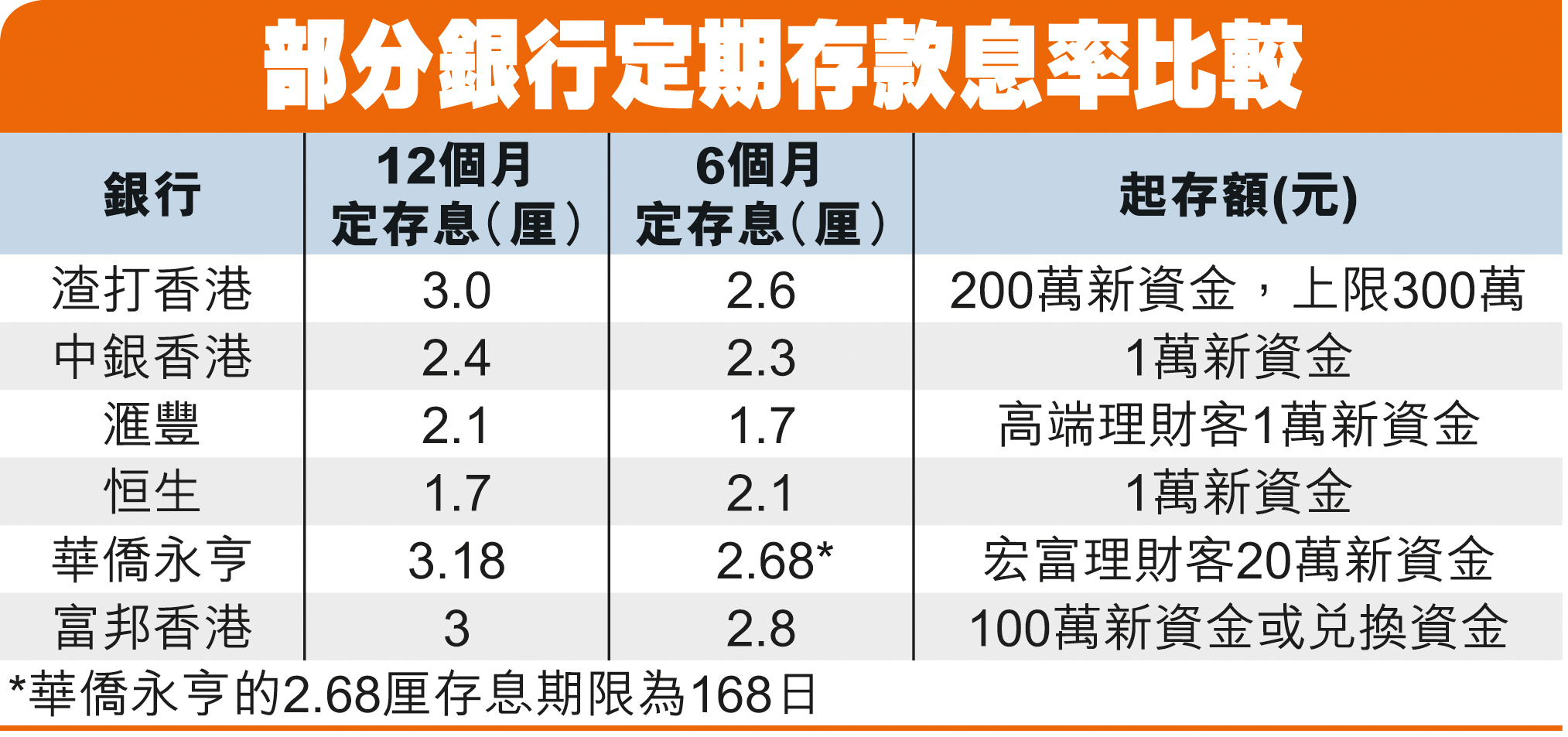 此外,中银香港(2388)近日亦有推出港元特优定存计划,一年期 定存息为2.4厘,6个月定存息为2.3厘,起存额仅1万元新资金。