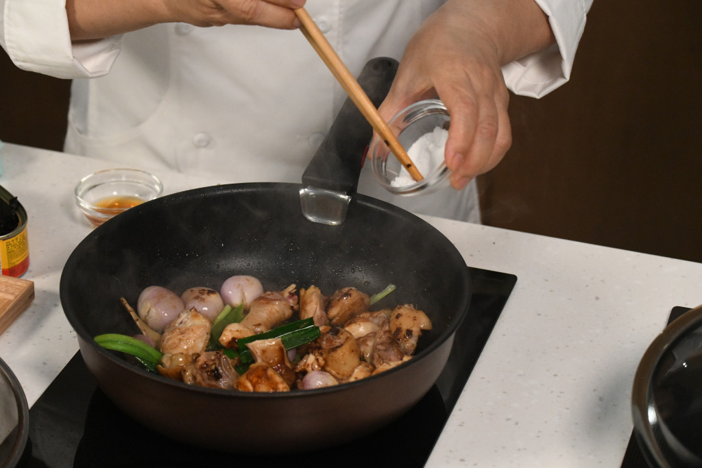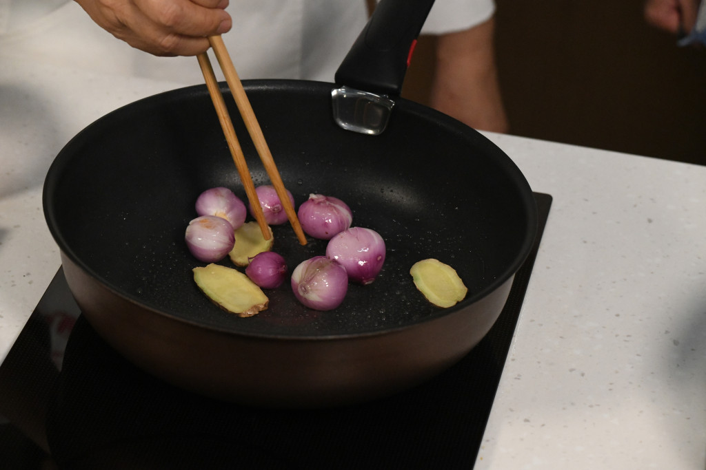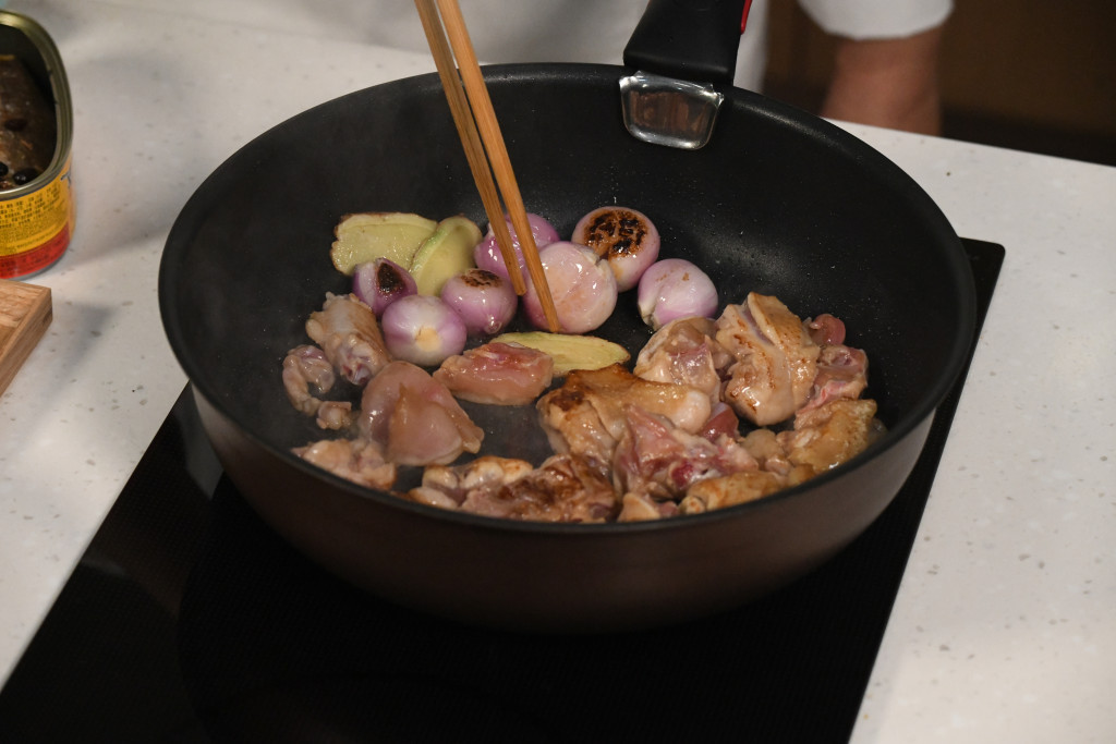 爆香的料头放在镬的一边,加入鸡件略为煎香。