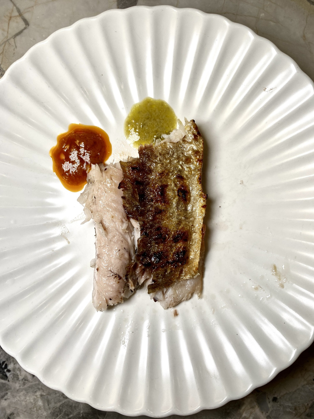 经熟成的马友,连皮放上Mibrasa Parilla炭烧烤炉,把鱼皮烧脆、鱼油渗出,最后以烟燻方法增加鱼肉的香气; 上碟时,伴以烟燻味噌、野蒜牛油酱及西班牙甘笋醋汁,更丰富鱼肉层次。