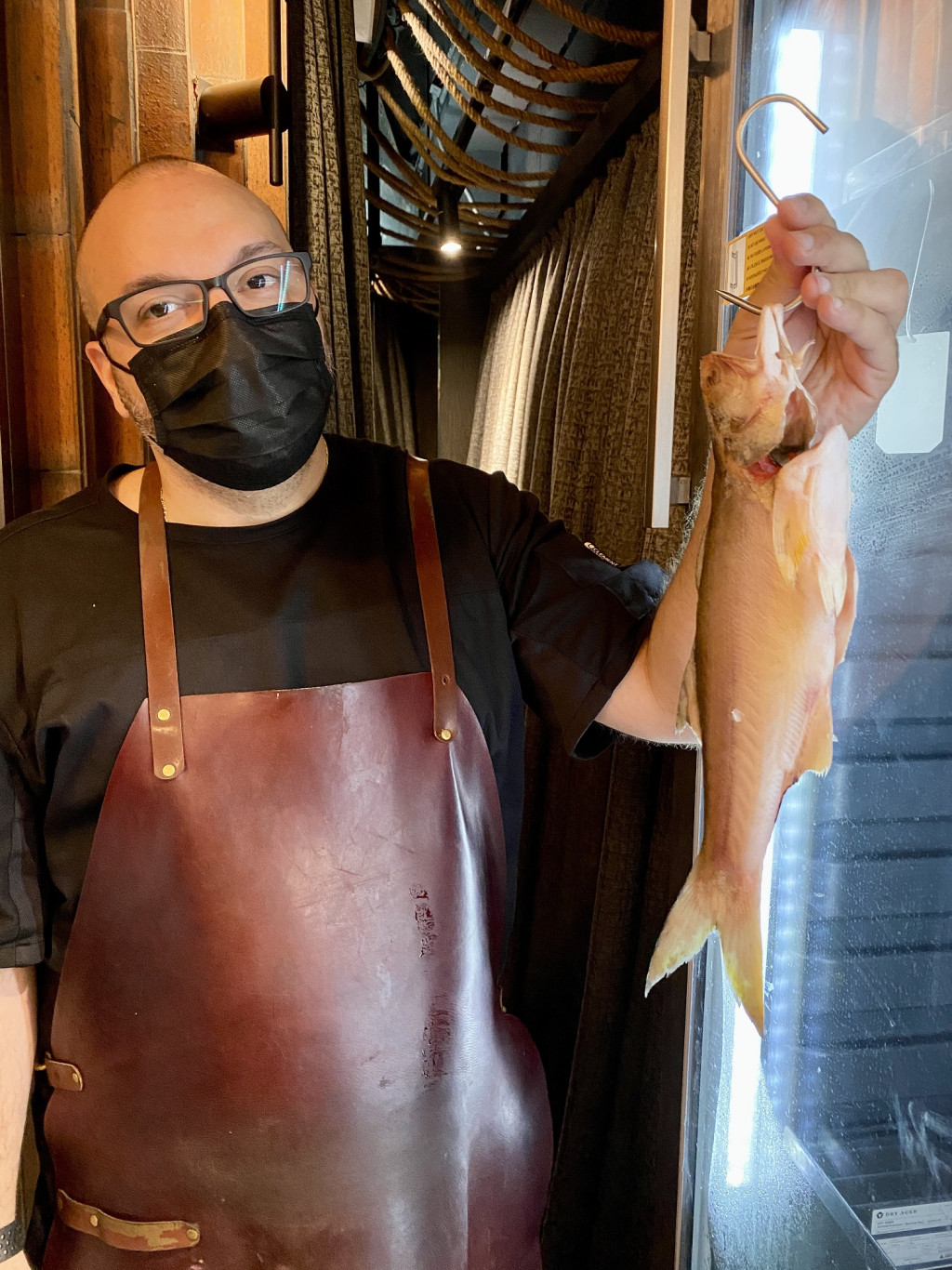 Fireside开业前,主厨Miguel就到本地鱼市场寻理想中的海鲜,竟找到了油光满身的马友,非常适合做熟成实验。 鱼油多、脂肪厚的马友,经清洁后,放入熟成柜内,让其水份流失,肉质变结实,鱼身的酶分解蛋白质、脂肪,转化成氨基酸和糖,提升鱼味; 这短短的3天,需每天检查,以防细菌滋生。