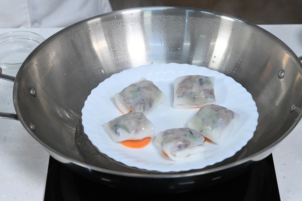 三姐利用斋肠粉包裹咸牛肉和蔬菜,变成相当有创意的蒸粉包,美味可口。