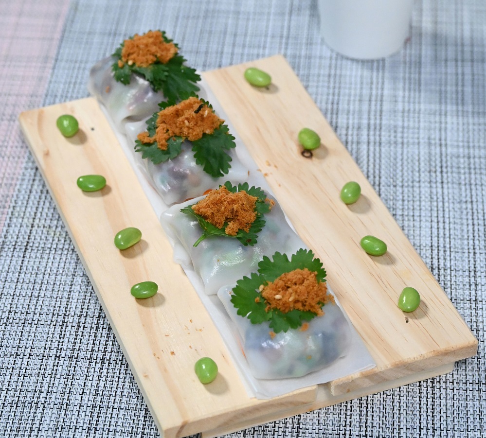 8. 将肠粉摊开,切成正方形加馅料包裹蒸2分钟,用芫荽及鱼松装饰即成。