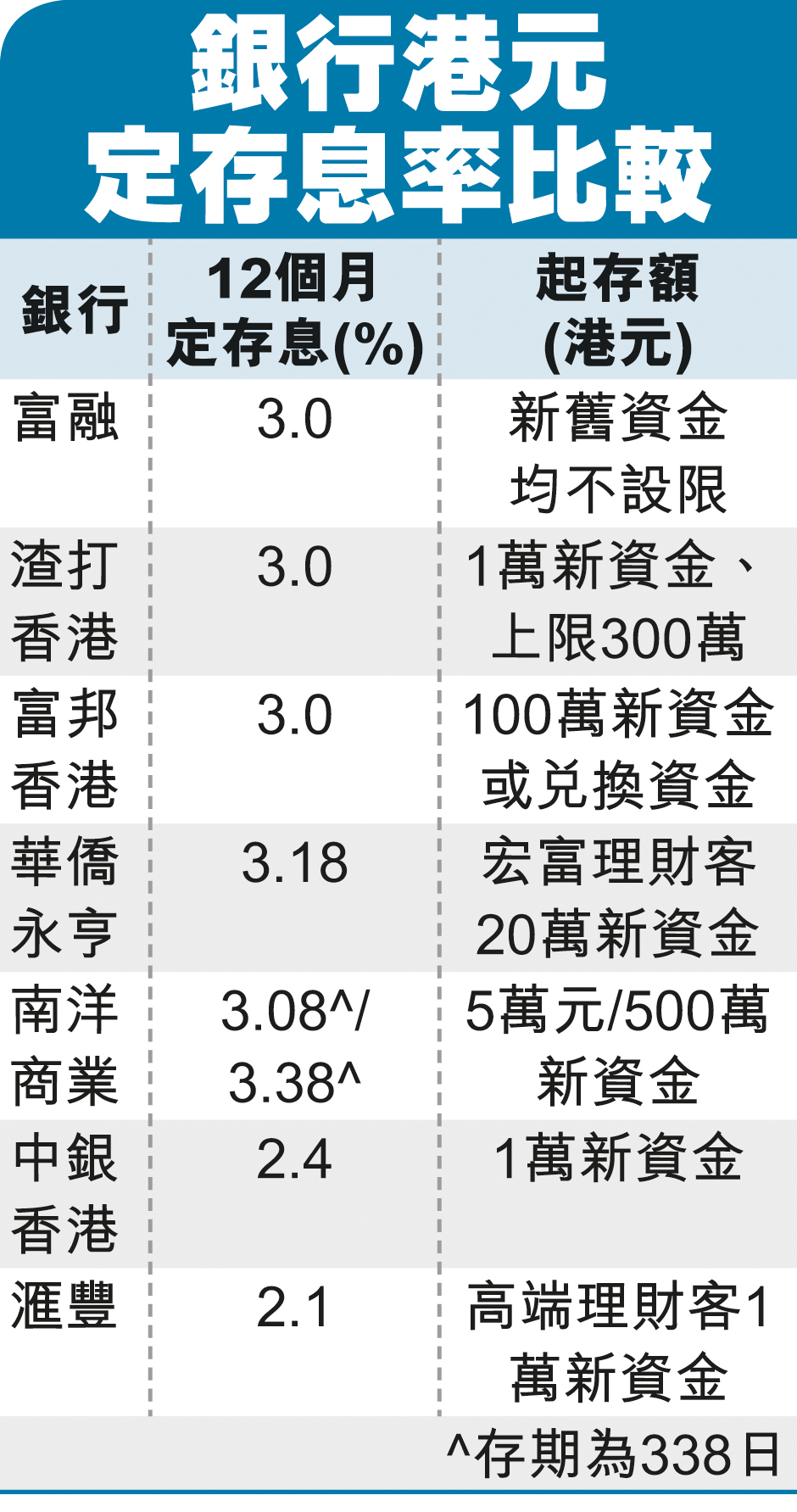 富融银行将其12个月定存息不论金额一律上调至3厘。