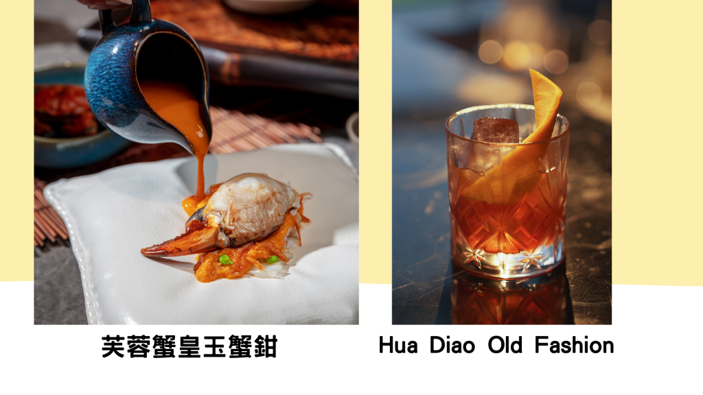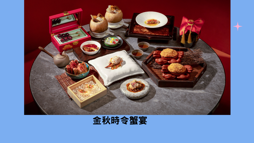 金秋时令蟹宴菜式包括:阿拉斯加蟹冻、15年古越龙山糟卤浸时令蟹、唐述佛跳墙、松茸焗酿蟹盖、芙蓉蟹皇玉蟹钳、波子棋盘、玲珑海参、纱窗雪影、八宝脆皮鸡、宫廷宝盒等。其中前菜阿拉斯加蟹冻使用吊鸡汤的做法,内里藏阿拉斯加蟹肉,冷藏后凝固成啫喱,鸡汤和蟹肉的鲜味互相融和。松茸焗酿蟹盖使用时令肉蟹及云南松茸,松茸的清香能凸显蟹的鲜味,加入金华火腿带来一点咸鲜味。芙蓉蟹皇玉蟹钳使用大肉蟹的蟹钳,加上“芙蓉”大闸蟹膏,低部垫了陈村粉,尽吸两款蟹的精华,鲜上加鲜。八宝脆皮鸡将原只鸡起骨,把花蟹拆肉,加入冬菇、火腿、虾米等材料与莲子糯米饭先蒸后炒,酿入鸡肚内再炸香。15年古越龙山糟卤蟹使用时令靓蟹或当造大闸蟹,采用古越龙山15年花雕酒及糟卤汁酿制,味道浓郁且鲜甜惹味。