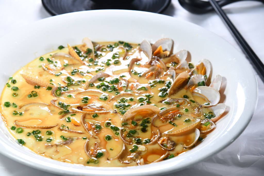 花蛤王蒸水蛋,大大只花蛤铺满在蛋浆中蒸至刚好熟,鲜甜滑嘟嘟。