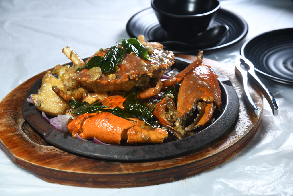 白胡椒大肉蟹,原只大肉蟹走油,再以原粒及生磨胡椒快炒至刚好熟,啖啖肉又惹味。