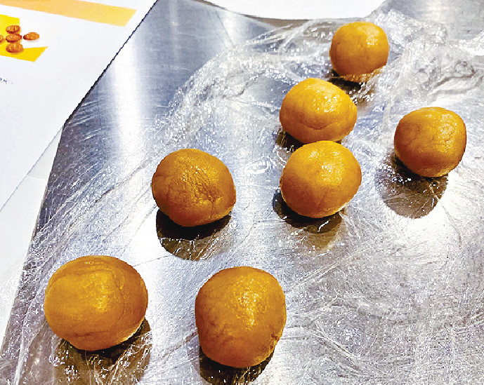 总括而言,炮制月饼只需耐心地按步骤处理,先搓外皮面团,再搓莲蓉馅,然后酿入咸蛋黄,将之包裹和压模便可烘焙,然而最难是月饼做到皮薄馅靓的传统手艺。 以是次课堂的迷你月饼为例,大家需以14克饼皮裹着44克年蓉馅料,稍一不慎,外皮便会出现裂痕,继而影响外观,还好在烹饪班师傅的指导下,轻轻以手将裂纹抚平便可做到完美无瑕。