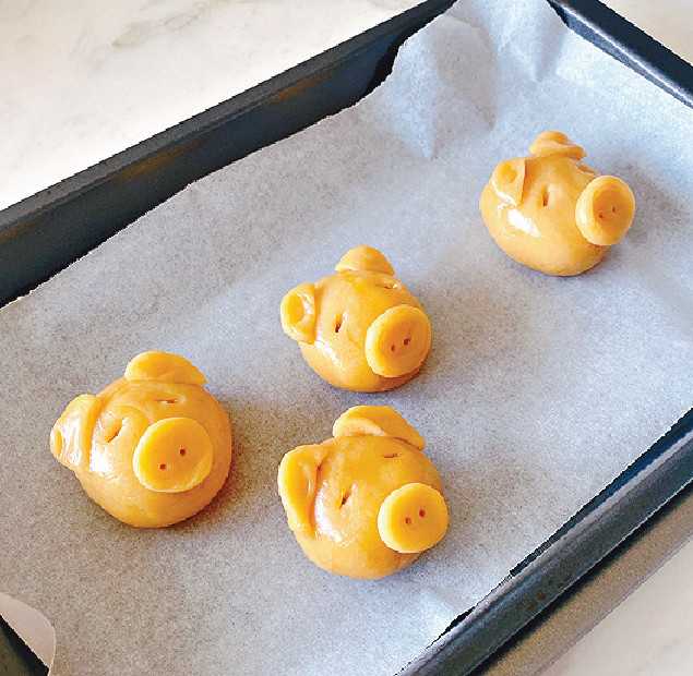 是日烹饪班同学即兴将饼皮面团的备份搓成猪仔,回味儿时点滴,Fifi也凑热闹,回家后翌日将月饼外皮面团塑成猪仔头,再扫上蛋浆,然后放入摄氏180度预热焗炉焗约10分钟便成。 味道而言,沿用面团和糖浆搓成的出炉猪仔饼,味道相对单一,质感外脆内软,风味恰如中式Soft Chewy Cookies,但对喜欢猪仔饼的朋友而言,所吃却是一份无可取代的儿时滋味。