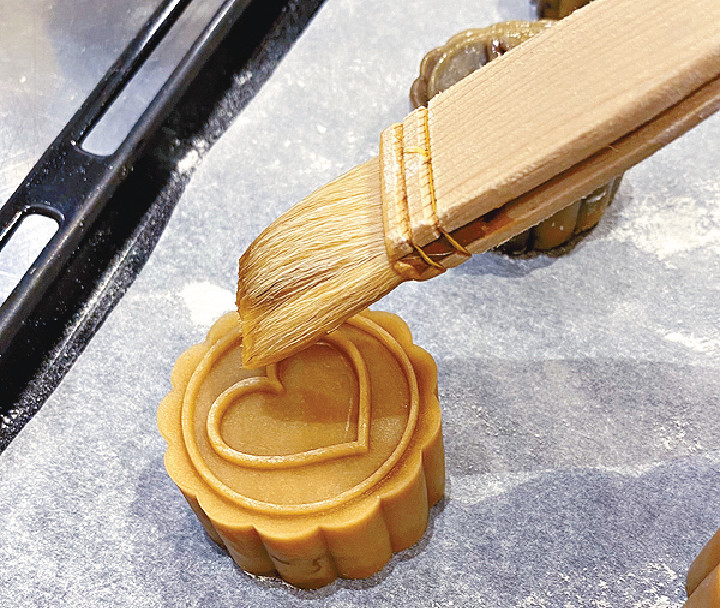 8. 月饼表面均匀扫上薄薄蛋浆,再将月饼放进180°C预热焗炉烘焙18-20分钟至金黄色。 出炉后把月饼放凉约4小时,再放进保鲜袋,置于干燥及阴凉地方最少2至3天待回油。